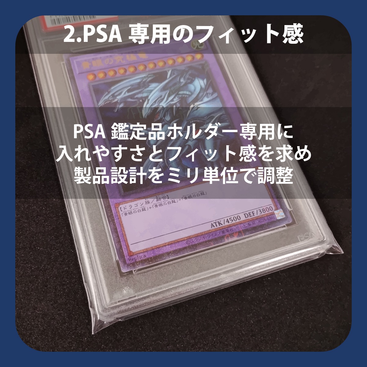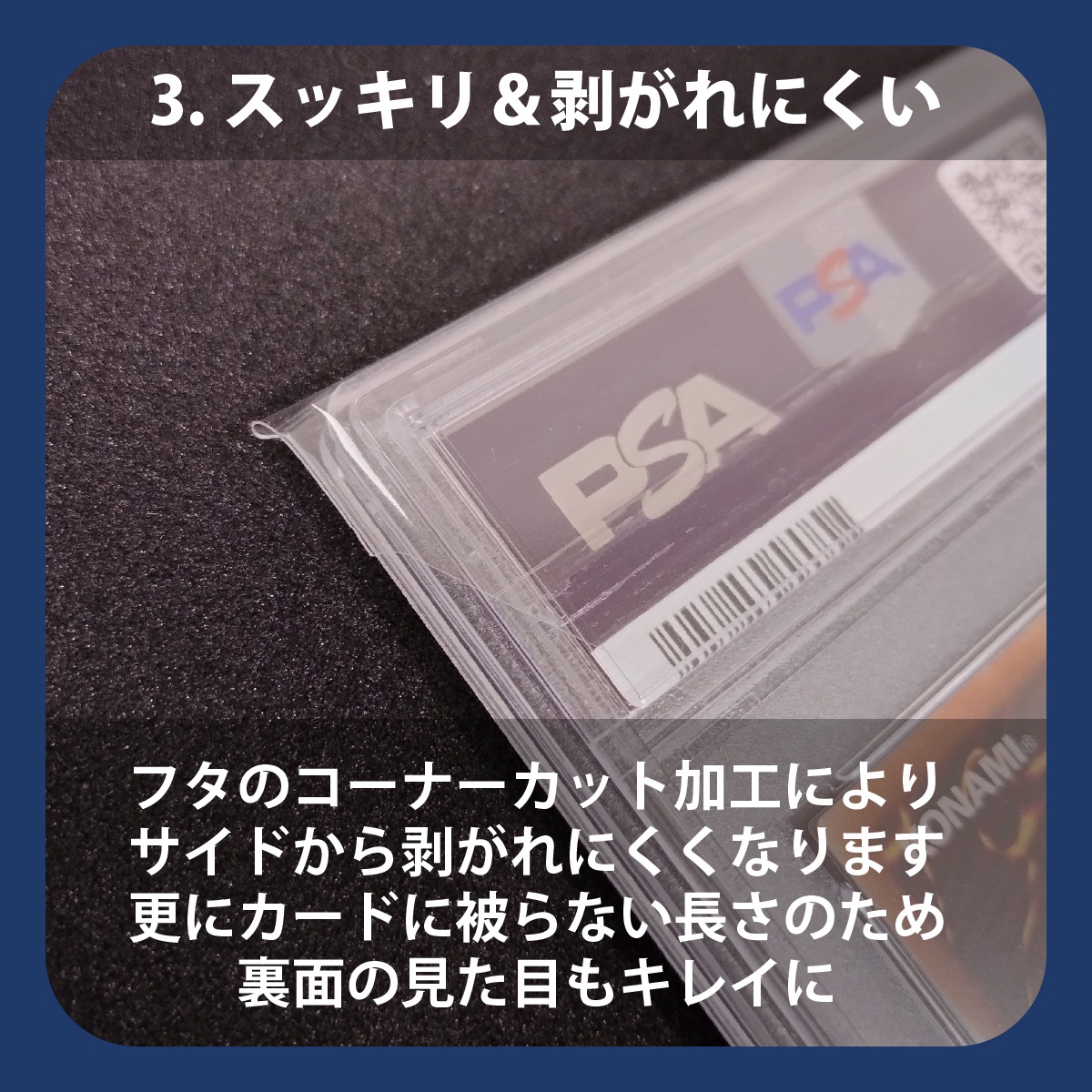 PSA鑑定済みケースにジャストフィットする専用設計。フタ部分をコーナーカット処理をしておりますので、サイドがスッキリ収まり剥がれにくい仕様です。品質重視のため日本製にこだわった ワイズシード の自信作です。