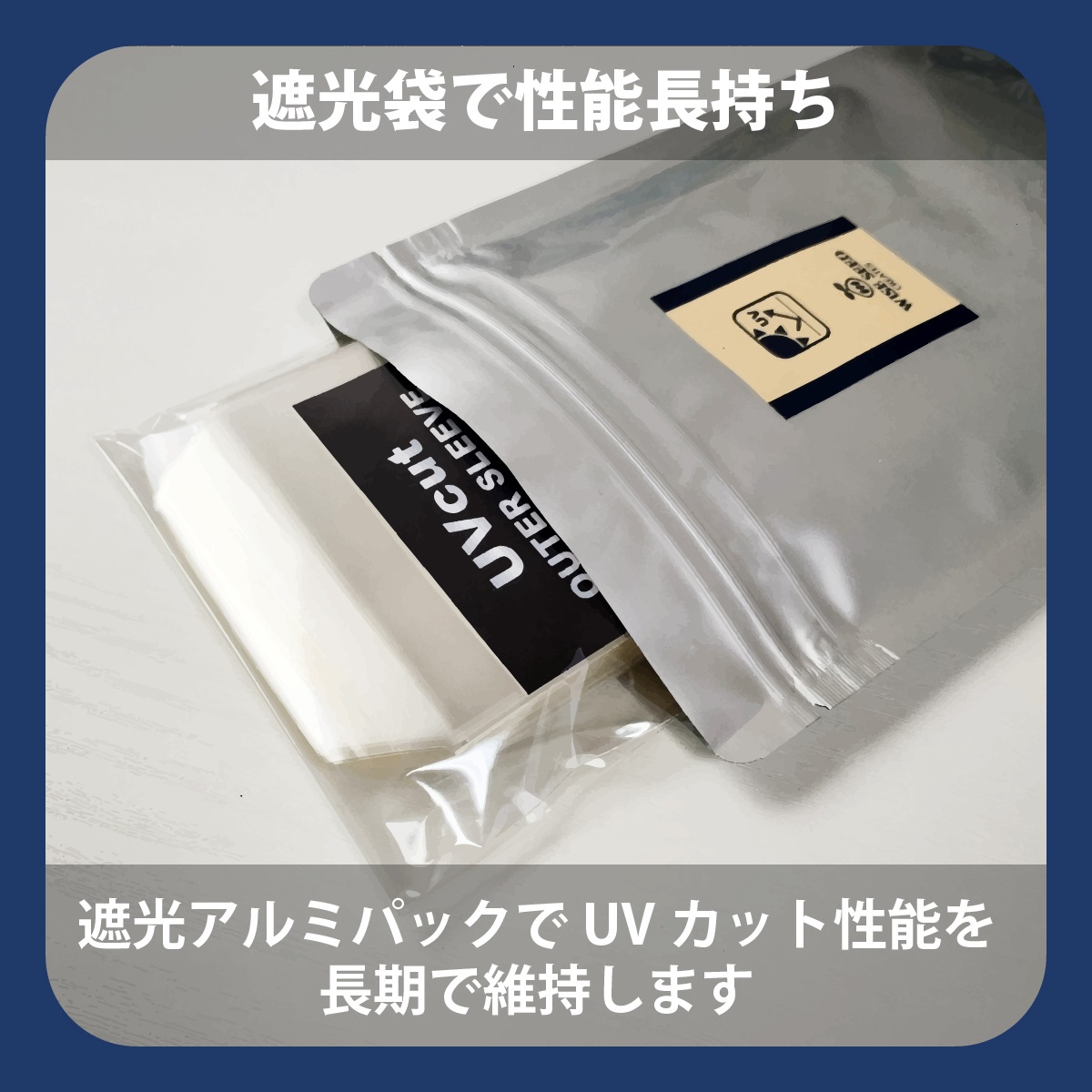スリーブはトレーディングカードの大敵である日焼け・色あせを防止するUVカットフィルムを使用しております。紙やインクの劣化を招く紫外線領域の約80%をカットする素材を使用し、長くきれいに保管・鑑賞できるスリーブを作りました。